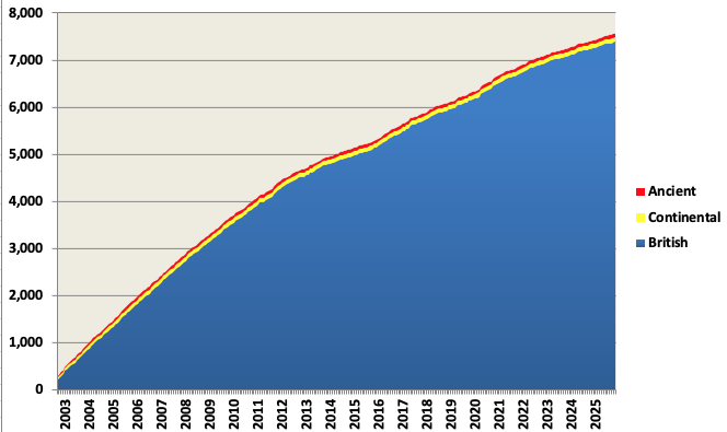 This page shows the genie data pages that have been uploaded into the database so far this year. Pages uploaded in earlier years are shown, in date order, here (2002-2011), here (2012-2021) and here (2022-2024). The subtotals in bold below, and on the prior-years pages, show the numbers of the pages at various midpoint dates (in order Section I-Section II-Section III = Ancient-Continental-British) which have been used to provide the following graph. This shows the growth of the database from September 2002 to November 2025 (excluding the many draft & temporary pages).